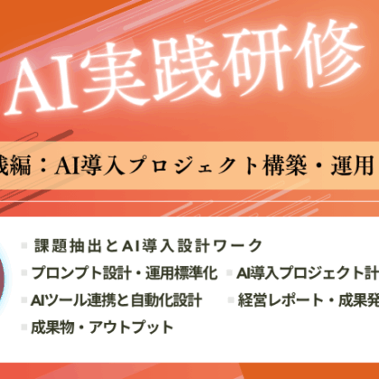 応用編で身につけたAIスキルを「実務導入」へ発展。実際の現場課題をテーマにAI導入プロジェクトを立案・実行・発表まで行う。経営層・リーダー・現場担当者が協働し、業務DX化の再現モデルを構築することを目的とする。